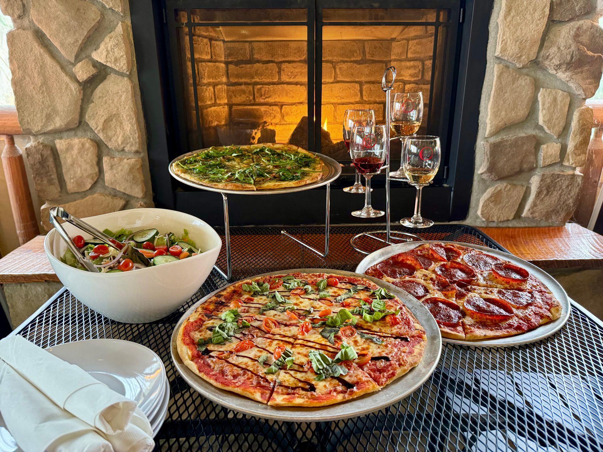Three cheese blend, olives, bell pepper, onion, tomato, and feta with a pesto base. Finished with arugula and tzatziki drizzle.